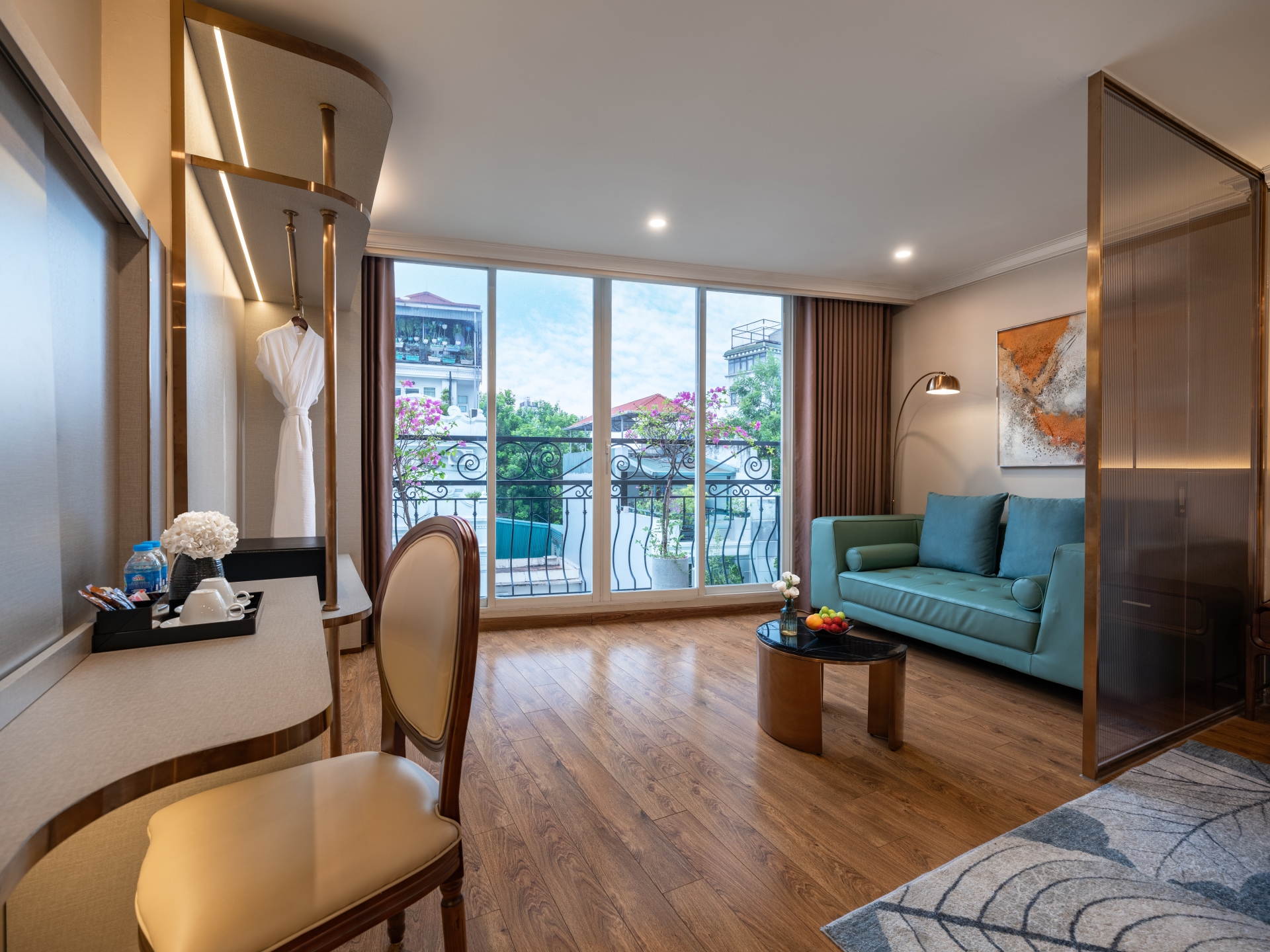The suite’s beauty extends beyond its interior design. The large balcony, offering sweeping city views, provides the perfect spot to relax, whether you’re enjoying the sunset over Hanoi or watching the lively streets below.